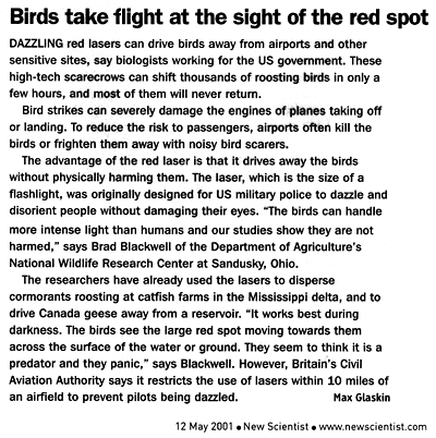 Home Bird Control Products - Measured performance - Radar - Deterrents - Deterrent controllers - Bird Data - Netting - Economic assessment Bird Control Solutions Articles Reports Info Request FAQ About Us Contact Us Links |